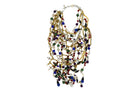 Un opulento collar que presenta capas de intrincada cadena chapada en oro que enredan una colección de cuentas semipreciosas y dijes de cruz únicos.