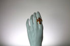 Este anillo de cruz naranja único está bañado en oro de 23 k y utiliza materiales antiguos y cristales austriacos de primera calidad obtenidos directamente de las bóvedas. Este anillo, elaborado a mano en nuestro taller de Kensington, seguramente agregará un poco de brillo y estilo a tu atuendo de fiesta.