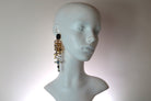 Grandes pendientes que presentan una cascada de cruces en varios tamaños y acabados, que terminan en un colgante de perla y cristal. Estos pendientes cuentan con una cadena bañada en oro de 23k unida de forma intrincada con anillos bañados en plata de ley y delicados cristales que captan la luz sobre la multitud de dijes de esta pieza.
