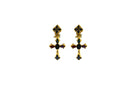 Estos vibrantes pendientes en forma de cruz cuelgan de un conjunto de perlas y tienen cristales en tonos joya engastados en un lujoso baño de oro. Estos pendientes, audaces pero clásicos, añaden un toque de color y dramatismo a cualquier atuendo.