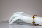 Una elegante pulsera con tres cruces cubiertas de cristales que se colocan horizontalmente sobre la muñeca. El diseño minimalista hace de esta pulsera bañada en oro un accesorio versátil para usar tanto de manera informal como formal.