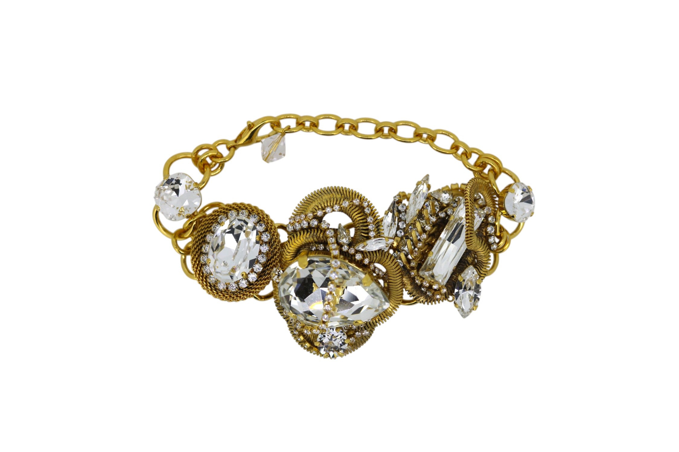 A show-stopping bracelet featuring large premium Austrian crystals entangled amongst sinuous 23k Gold plated chain and draped in further crystals.