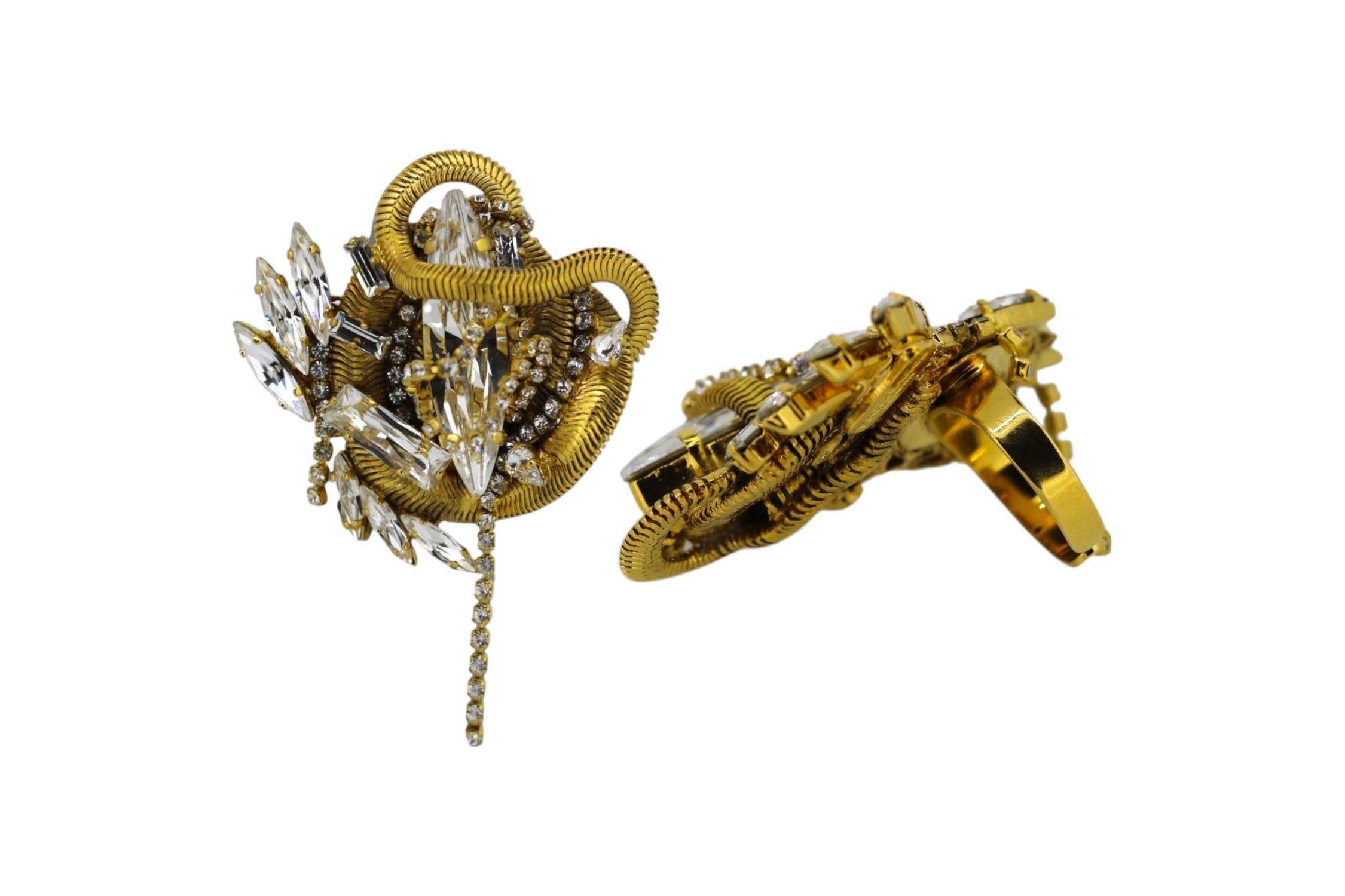 A dazzling cocktail ring encrusted in a variety of premium Austrian crystals, entwined with 23k Gold plated chain and finished with an adjustable band for comfort.