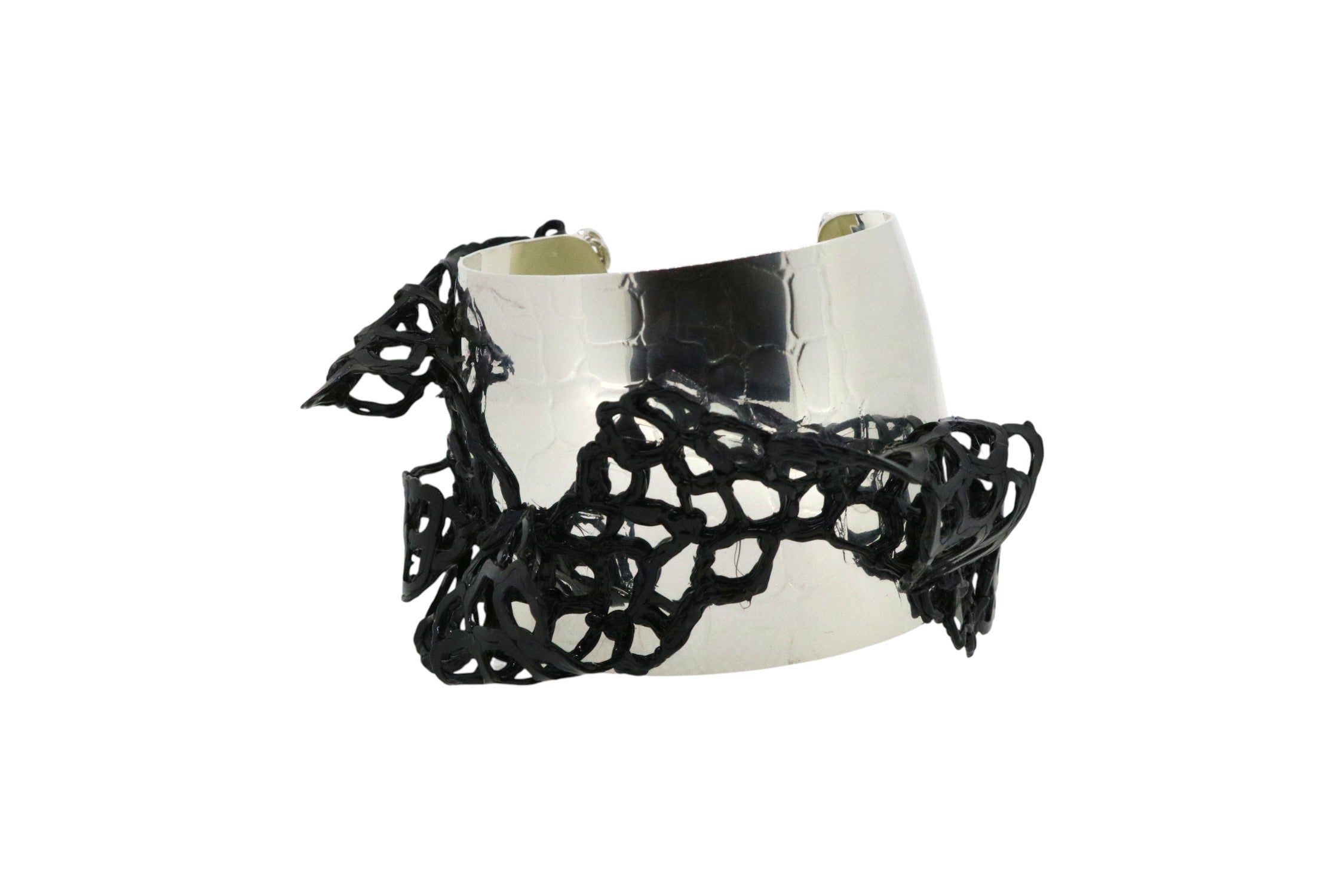 Designed in collaboration with Karina Bond, these bold cuffs feature swirling 3d printed motifs layered over embossed Sterling Silver Plating.